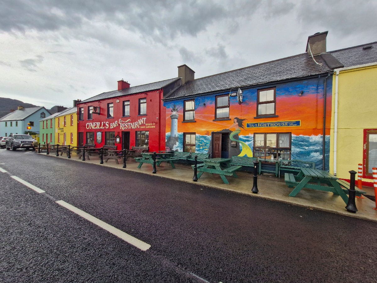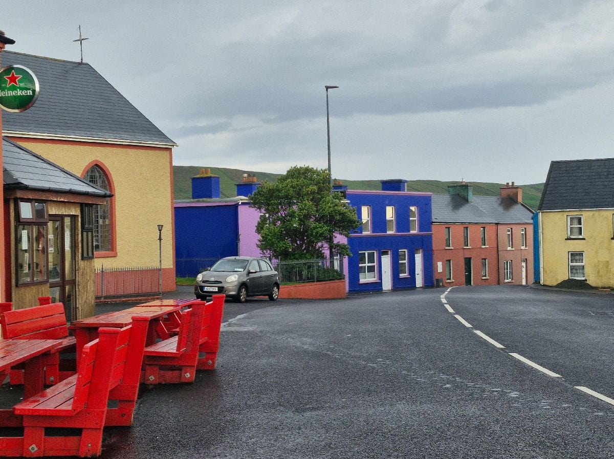 La pluie commence à tomber alors que je suis encore à 4 km de Casteltownbere mais elle n’est pas forte. C’est au moment où j’attache mon vélo pour entrer dans une supérette qu’une violente averse tombe. Je me réfugie dans le magasin, fais mes achats. Quand je ressors la pluie continue à tomber très fort. Je pique-nique à l’abri sur des tables et bancs disposés sur une petite place.